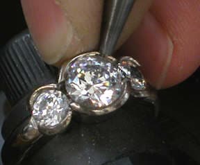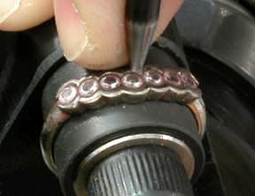 The diamonds were seated in their bearings and checked for level. The ring was lightly heated and red utility wax was melted into each bearing "locking" the diamonds in place. To hammer set the diamonds, the Foredom Micro Motor with the Stone Setting/Engraving Micro Motor Reciprocating Handpiece was used. The technique included hammering downward on a 45 degree angle on opposing sides of each diamond. Then the hammering was done at a 90 degree angle directly from the top as shown in this photo.