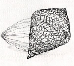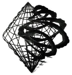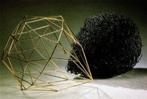 These last pieces, Duel (1987), In/Out (1987). The Attraction of Opposites (1988), Heart of Darkness (1988), are still about Inside/outside, enclosures, containment and psychic transference. However, the forms themselves have taken an additional radical transformation. Gone are the stolid meal sheathing of the boxes, replaced by a conceptually rigorous wire mesh. The forms are no longer familiar as commonplace packages but now have become geometric configurations of almost abstract purity, seemingly derived from mathematical formulas or the controlling regularity of computer-aided design. The walls themselves are transparent, providing no clues to the separation of inside/outside but are more weblike-they divide space rather than containing volume—and less pictorial. cleansed of all emotive, symbolic or sensual expression.