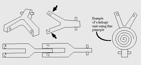 As in the previous example, many cast hinges are designed with the model made in an 'open' position so that after casting a unit can be inserted, and then the unit is closed onto studs so as to rapidly assemble the linkage system. Here is another example.