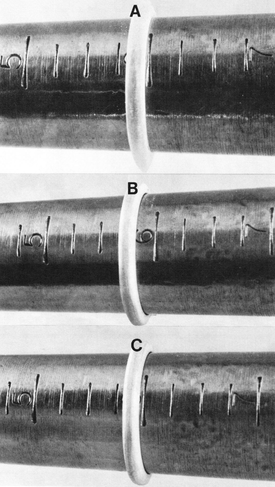 | 2 The three segments of the photograph provide a practical demonstration of typical casting shrinkage. A) The original model B) Shank as cast C) Final size after buffing |