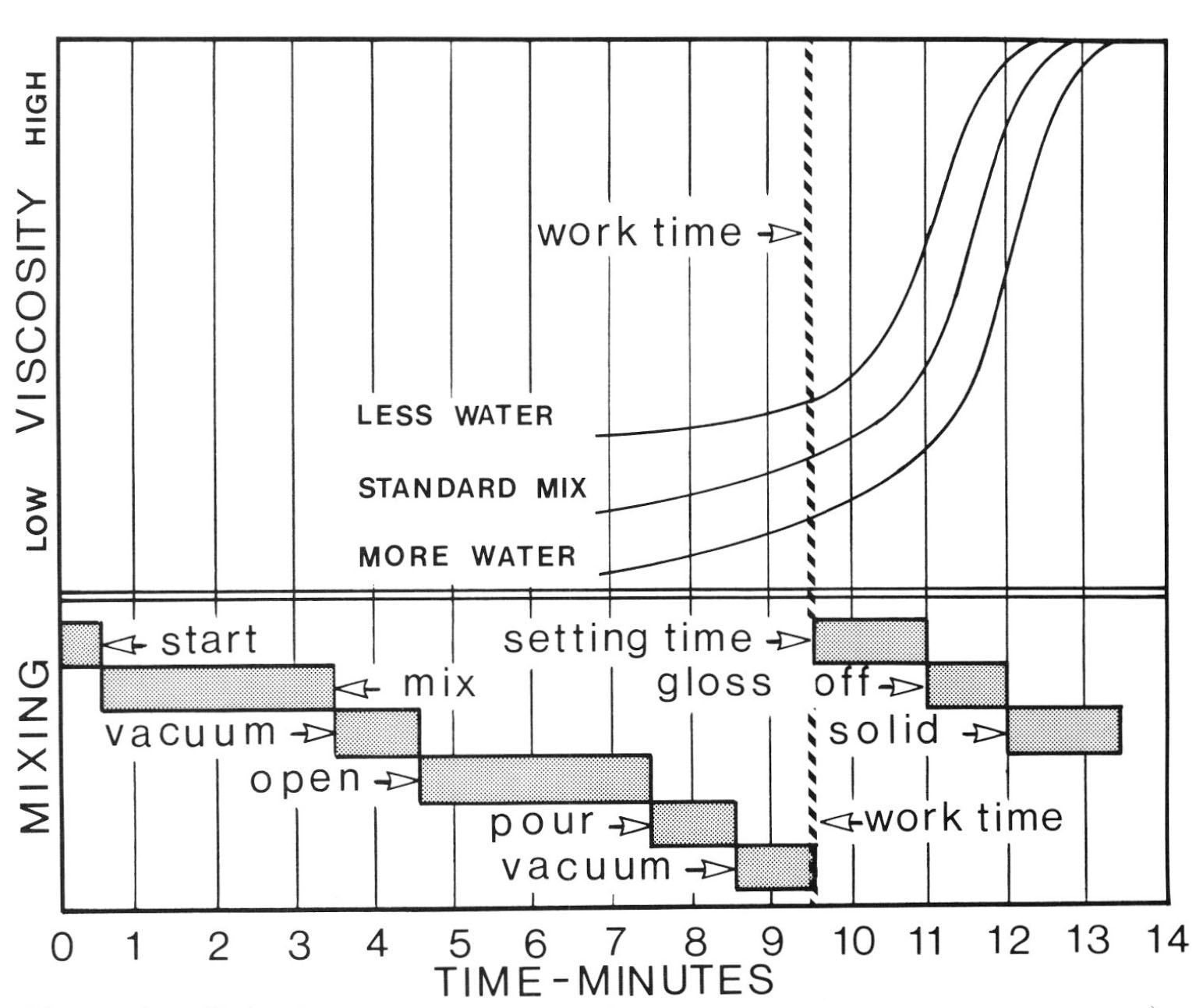 The viscosity of the investment mix changes almost constantly during the time between mixing and setting. If you measure this viscosity change, the requirements of the investment process become clearer. The top portion of Figure 4 illustrates the viscosity properties of an investment mix. The system starts out with a low viscosity, which increases dramatically at the setting time. The rapid rise in viscosity is a very significant characteristic. It establishes the amount of time available to complete the investment process. This is known as the work time.