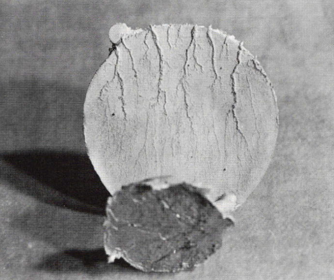 Figure 1 illustrates the thermal expansion properties of two different investments. One is based entirely on quartz (80%) and calcium sulphate (20%). The other is a mixture of quartz, calcium sulphate and cristobalite. The chart indicates that the cristobalite-based investment will expand about 1.2% as it is heated from room temperature to 572°F/300°C. In the same range, the quartz investment will expand approximately 0.05%. You will notice that the expansion curve of the cristobalite investment has a very sharp break. This corresponds to the silica inversion point at 450°F/232°C. At about 572°F/300°C the investment stops expanding to any significant degree. This sudden change is expansion properties causes cracking if the investment is cooled below the inversion point.