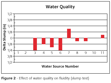 The measurement of fluidity is the slump test. Figure 2 shows the degree of slump versus water source. Here again on the y-axis is plotted the difference from the standard. The standard is the x-axis. Notice that some water sources did not affect the slump at all. Source number seven made the slump larger than the standard. Most of the others made the slump smaller. Each water source affected the slump in its own way. Now do not get concerned about which water source most represents your water. The point here is that each water source does something different. As a result, this may cause casting defects, such as trapped air, watermarks or rough surfaces.
