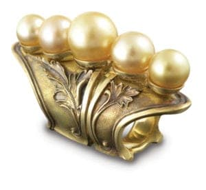 We designed the ring in 18k and 22k yellow gold because those golds' protective warmth supports the image of the greave shielding the leg. Similarly, the full-finger ring echoes the idea by offering finger defense. Its two hand-carved metal parts are held together by a sliding hinge, which allows the ring to bend without causing a break in the pearls. The pearls' medium golden color complements that of the antiqued metal. We were lucky to find same-color natural pearls whose sizes, which range from 10 to 14 mm, work well together. Their shade is based on the temperature of the South China Sea where they were grown.