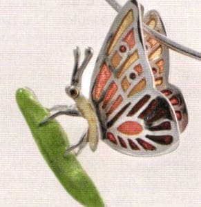 The necklace is composed of an orchid cluster (Dendrobiums), symbol of mystery and passion evoking the elegant simplicity of a woman, and butterflies (Lyphiras, an Australian orange butterfly). Wearing each parts separately makes four different necklaces.