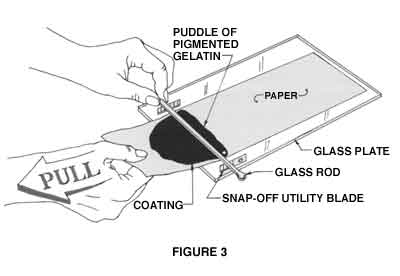 "Tissue" is misleading, but this is how the thick gelatin-coated paper is described historically.The requirements of the paper are that it be smooth and strong and able to be wetted repeatedly.Any texture to the paper will show up as a dark pattern in the final print.The ideal paper is a type used for pen and ink drawing.It is designed not to pucker when ink-washed and it is absolutely smooth and without texture 8 .Woodrow Carpenter's method of spreading the pigmented gelatin is superior to any of the other methods suggested in the literature 9 .He recommends the Doctor Blade Method, illustrated in Fig, 3.In this arrangement, the glass rod is raised above the glass plate 10 by the thickness of a 3/8″ wide snap-offutility blade (i.e. 0.016″, 0.4mm).