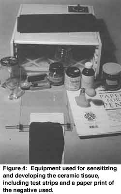The details of the working procedures, materials and recipes for this technique have all been tested and have been gleaned from several sources, historical/archival and contemporary, none more thorough than Woodrow Carpenter's article in Glass On Metal, Vol. 5, No. 2, April 1986. If the reader reviews that article, it will be clear that many of the procedures described here are Mr. Carpenter's, while others have been altered after Mr. Carpenter's and still others are derived from experimentation and other sources. This article endeavors to guide the reader around the various pitfalls encountered through months of trial and error, and directly towards a satisfactory end product - a fused photograph in enamel.