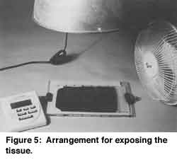 Dichromated gelatin is most sensitive to ultraviolet radiation. A cheap, controllable source of UV is a 500 watt (or even 250 watt) blue photoflood 15 in a reflector. Try the 500W. at 24″ (250W. at 15″) from the negative 16 . These lights are hot, so have a fan blowing across the negative to protect it and the tissue from the heat during the exposure.