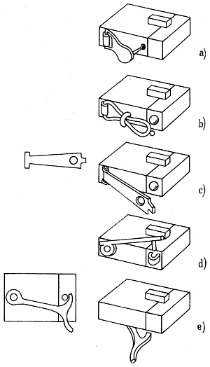 The safety shown in figure 12.50e illustrates a device that can be almost completely hidden beneath the box catch. In this case a horizontal action is used to hook or disconnect a loosely riveted hasp. The pivoting section can be sawn from sheet or made from wire and will probably require delicate adjustment to achieve a snap fit.