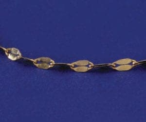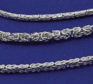 Manufactured in the USA, this byzantine chain is available in sterling silver and 10k, 14k, and 18k yellow and white gold. Sold by the foot or in cut lengths, the chain comes in 020 to 040 gauge. Contact: National Chain Group, 55 Access Road, Warwick, RI 02886; 1-401-732-6200; fax 401-738-1684; e-mail info@natchain.com; natchain.com.