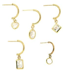 Designed to look like a hoop, these 14k yellow gold half-hoop earrings come with a jump ring from which backset bezel drops can be suspended. Drop options include a 6 mm through 9 mm round bezel; 5 mm by 5 mm or 6 mm by 6 mm heart bezel; 7 mm by 5 mm or 8 mm by 5 mm pear bezel; 7 mm by 5 mm octagon bezel; 7 mm by 5 mm oval bezel; and 5 mm by 5 mm square bezel. The earrings are available with or without stones. Contact: LeachGarner, 49 Pearl St., Attleboro, MA 02703; 1-508- 222-7400; leachgarner.com.