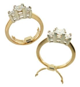 Available in 14k white and yellow gold, the Flip Guard was recently redesigned to add bead shapes to the ends of the insert, creating a more comfortable fit. A cost-effective and easy-to-install solution for fit problems due to large knuckles, the Fit Guard is designed to reduce finger size up to three sizes. No components of the guard are visible on the outside of the wearer's finger. Contact: R Findings, 625 Panorama Trail, Bldg. 1, Rochester, NY 14526; 1-800-422-7624; fax 888-243-5484; e-mail sales@rfindings.com; rfindings.com.