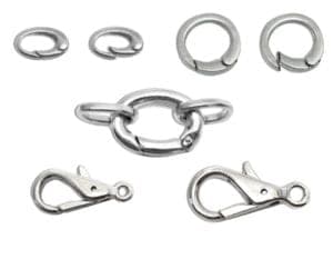 Available in a variety of sizes, these self-closing rings and clasps are composed of a base metal with an imitation rhodium finish. Styles include a 12 mm oval ring, 14 mm round ring, 21 mm round with two loops, 23 mm lobster claw clasp, and 28 mm lobster claw clasp. The pieces are sold by the dozen (with a five-dozen minimum) and by the gross (144 pieces). Contact: MAGIC NOVELTY CO. INC., 308 Dyckman St., New York, NY 10034; 1-800-449-2780; fax 212-567-2809; e-mail stevel@magicnovelty.com; magicnovelty.com.