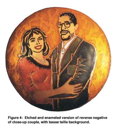 However, throughout the years, while teaching numerous workshops in this technique, I have been asked this question consistently: "Can one use photographs?" Originally, my response had been that only black and white line drawings were appropriate. Black lines will perform like a resist and will not etch, while white registers "clean" and will etch out. Unlike printmakers, who can create a range of gray tones on paper, the metalsmith traditionally etches away an area in the metal or leaves it intact. In other words, although a stippled or irregular area in metal can be achieved, metal usually is totally etched out in a given area, or it is not. For enamelists working in champlev?, it is especially important to have "clean", etched out areas (unless one is doing experimental or unconventional work) in which to inlay the enamel.