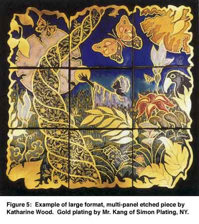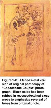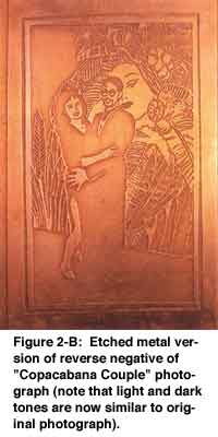 At this point, the "improved" photo/Xerox was transferred to the PnP and subsequently to the metal (again, see Glass on Metal? , Vol. 15, No.3, Aug. 1996) and then etched. This time, the results were impressive, but one result had not been anticipated. All the negative (i.e.) black areas in the original photo/Xerox were now positive (unetched, appearing "light") in the metal, while all the positive (i.e. white) areas in the photo/Xerox were negative (etched away, appearing "dark") in the metal. The explanation for this occurrence is that any area in the transfer registering as black will not be etched; in other words, the black acts as an acid resist. In many cases, this reversal is not important and sometimes even an interesting variation on the original, but in other instances, it is disturbing. For example, a photograph of a white building with darkened windows would etch out as a recessed (etched-out/"dark") building with raised (unetched/ "light") windows.