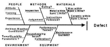 The fishbone diagram is another method for identifying defect causes. The "fishbone" takes an effect (defect) and traces its possible causes using the five factors of a process — People, Methods, Materials, Equipment and Environment. A team draws out the skeleton of the fishbone by identifying all the possible sources of variation in the process. Any variation of the process that occurred concurrent with the defect is documented on this tool. Minor excursions from the process or any special process events are listed. There are many process variables, which can contribute to defects. The fishbone diagram can efficiently identify the significant sources of the variation and allow the proper corrective action to be initiated.