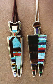 At roughly the same time, Sabatie remembers, Loloma received a book about Egyptian jewelry that proved wildly important to him. "His inlay reference was the old Hopi earrings that katsinas wear," recalls Sabatie. These earrings inlaid mosaic of turquoise with tiny pieces of abalone in the center, on square pieces of cottonwood, and date to Mesa Verde (1100 A.D.).