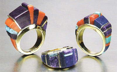| Rings. ca 1980 Left: 18k Gold, Sugilite, Coral, Turquoise, Charoite Height: 1 1/2′ CTnter: 14k Gold, Lapis Lazuli, Charolite,, turquoise Right: 18k Gold, Sugilite, Coral, Lapis Lazuli, Turquoise |