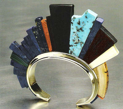 To come to Loloma's jewelry with no prior knowledge, one might identify strains of art nouveau in the constructions as precise and intricate as stained glass. People close to him cite architectural influences: skyscrapers in Manhattan or aerial views of Paolo Soleri's Arco Santi near Flagstaff, Arizona. Yet the exaggerated, masked geometries of Hopi katsinas (kachinas), interpreted as abstractions, are paramount in Loloma's work, The dazzling height bracelets, studded by multiple gems, jut as high as an inch and a half and span up to four inches in diameter. Surface contrasts between jagged and smooth, shiny and matte, elevated and flat make the jewelry at once earthbound and heavenly, Stone Age and Space Age. Throughout, Loloma deeply engaged with the cross-cultural practice of patterning the sacred through materials.