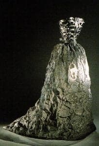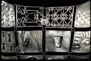 Charlotte's forms wrap the female in chain mail, heavy metal straps, chased and ornamented sheets of metal, and delicately fabricated squares of silver. The ghost-like quality of what is missing is potent in Charlotte's work. Armor encased torsos are often padlocked in some way. Charming is a lovely vest of constructed silver units chained together. There are boxes of chocolates, filigree gates, a square of key holes, a window through which we glimpse a nude woman, and a tiny padlock covering the heart. In Dance the hinged metal torso is locked from behind. In On The Surface the lock hangs below a chased metal vest suggesting the weightiness of the garment, and a chaste enclosure for the chest, the heart, the whole woman.