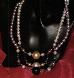 Golden, white, and rose-colored pearls of dubious quality dangle from her outstretched arms. At least 20 more strands are draped around her neck. They can be purchased for about $3 a strand.