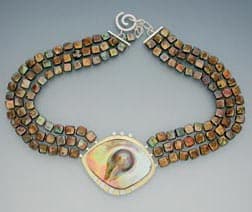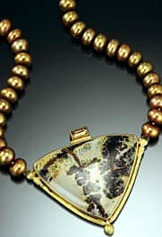 Donna Wilson's designs have moved in the opposite direction. "My designs were simpler before I started using pearls," says Wilson, a jewelry artist based outside of Washington, D.C. "[I do a] transformation series, [and the pearls] started me thinking about what unusual kinds of materials I could use for headdresses. I use pearls, carved semiprecious stones, fossils, beads, and ammonites. So the pearls opened new channels of creativity."