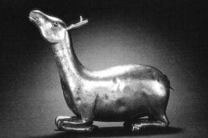 Other animals, such as the deer, are symbolic in Buddhism. It is said that in a previous life Buddha lived on earth as a deer. Wolves, a common sight in Mongolia, are associated with death in Buddhism. The sculptures of a deer and a wolf, in Figures 8 and 9, are made from gilt copper alloy, dating from the late 18th-19th century. The influence of Zanabazar is seen in the use of simple forms rather than elaborate details to depict each animal. There are no pedestals to obstruct the lines of motion in each animal.
