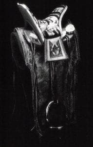 The most important animal to Mongolians is the horse and they honor their steeds with saddles that are elaborate pieces of art. By studying a saddle, one can tell both the tribe and the status of the rider. The Khalkha saddle shown in Figure 20 (20th century) is constructed of a wooden frame and covered with leather and a patterned Tibetan wool. Strips of repoussé silver decorate the high pommel and the rim of the cantle.