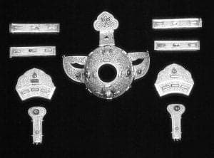 Mongolian metalsmiths were well respected, and as with many other trades, their skills were passed on from father to son. Most Mongolian metalworks were either religious artifacts or had a utilitarian purpose. Even some of the most decorative works were functional, too. For example, jewelry was made in a specific style to distinguish one tribe from another. It might also indicate a woman's marital status and her wealth. Figure 11 shows a set of ornaments dating from the 19th-20th century and worn by a Khalkha woman. These ornaments are useful as well as decorative. Each piece to the right and to the left of the bracelets has three objects dangling from chains: an ear pick, a pair of tweezers' and a nail cleaner. Ornaments made for men usually had eating utensils, such as knives and chopsticks. The workmanship of the silver bracelet shown at the bottom is superb: dragon heads in high relief decorate each end of the bracelet and flow into the twisted pattern of the band.