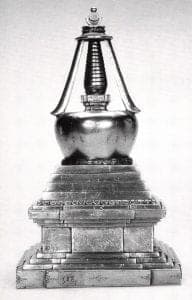 Another important Buddhist symbol that was also sculpted was the stupa. Originally developed in India, stupas are monumental shrines erected in places in ancient India that marked the great events or actions of Shakyamuni Buddha's life. They became so popular that eventually numerous stupas were built throughout Asia to house the sacred texts of other sages as well. In Figure 2 the model of a stupa made by the Zanabazar school is similar to ones found in Tibet and Nepal. Several levels of step-like platforms build up the height of the stupa and lead to a bulb-shaped body that houses a niche wherein a deity sits on a throne. The stupa has a few engraved patterns and some simply lined forms of animals, such as an elephant and a horse. As the construction of stupas multiplied throughout Asia, so too did the variations in the form of the stupa from country to country.