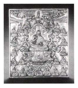 Metal casting was not restricted only to the production of freestanding sculpture. Figure 3 shows a cast gilt bronze plaque that depicts Zanabazar sitting on a lion throne surrounded by his pre-incarnations. Foliage snakes out from the throne. This narrative of Zanabazar's lineage is quite detailed for such a small scale relief.