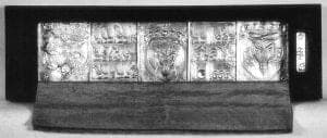 Metal was also used with other materials such as textiles and papier maché. In Figure 4 the book cover for 220-page sutra, dating from the late 19th century, is a unique collage of materials. The sacred images and text are flat-hammered silver and raised gold. Red coral and bone make up the yin-yang symbol. Brocade curtains embroidered in silk protect the page.