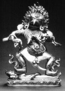 A frightening-looking guardian goddess Kakasya (half crow and half human female) is shown in Figure 6. Sharp, angular shapes protrude from the deity in a threatening manner. Red pigment was painted on the hair (red hair symbolized a wrathful deity) and a row of skulls form a headdress, above the third eye. Kakasya dances on top of a corpse, which lies on top of a lotus petal base. (This type of lotus petal base is associated with Chinese sculptures from that time.) A snake coils around the goddess like an ornamental decoration, intertwined with chains of jewels that also envelop her.