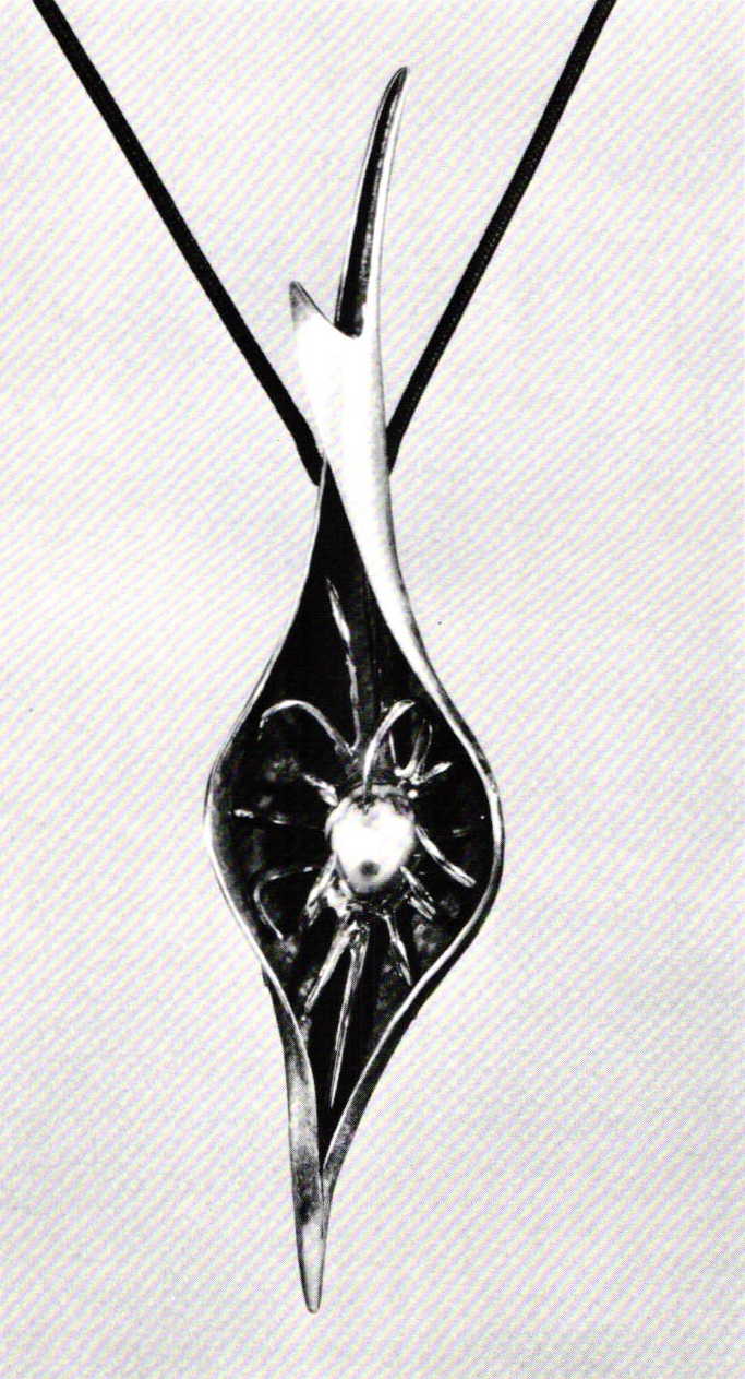 The mushroom series led to other natural models like the milkweed pod. Christian viewed the pod as a nautral "shelter" for a spiny gold casting and an unusual stone (figure 3). Also, the shell could be a smooth oxidized surface or richly overlaid with many variations. The "pods" brought him early success, with awards at the 1956 "American Jewelry and Related Arts" in Rochester New York and the 1957 and 1959 Midwest Designer Craftsmen competitions in Omaha, Nebraska. A seedpod pendant and a fused silver and ebony bracelet were selected for exhibit at the 1958 Brussels Worlds Fair.