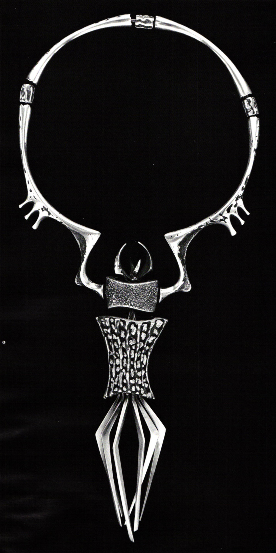 My husband's last pieces, which were to be his final legacy, were a departure from his earlier work. On a larger scale, they were integrated as whole entities. One, Cleopatra's Necklace (figure 4), is an insect form with articulated segments. The center thorax area has rows of small gold nuggets set between fused vertical silver ribs. There was an intense urgency to complete these works before his untimely death in 1974.