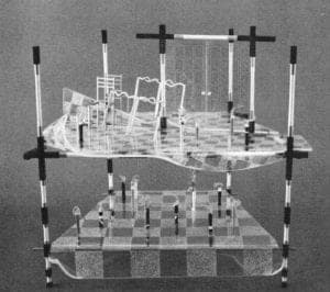 Color is of major importance to the work, and Clark utilizes it with finesse. Pastel shades, color gradations, colored metal frames, soft and rich as well as bold and bright tones—all are worked skillfully to match a mood and subject. The frames around which the scenes are draped resemble bedposts, tables, door frames and cages. Their colors emphasize the changes often found in the profiles of architectural details. These references are important to each statement Clark makes. Her compositions speak simply of repose or a frozen activity or thought. Surrealistic drama is handled elegantly in Party Dream, where the stage is very tranquil. The floor slips and slides like hallucinations, and, as in dreams, we do not question what may not fit into our reality.