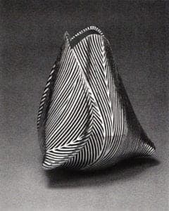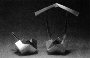 Choo's creativity is nowhere more evident than in her most recent series of works, which draw on several areas of her expertise. She was struck by the malleability and transparency of various kinds of fine metal screen-mesh, which she first found at a hardware store. Minutes after bringing some wire mesh to her studio, she was instinctively folding a square of the material in the same way as in classic Japanese origami paper folding. She folded the square diagonally into fourths, then bent two opposite corners together and fastened them; then she bent the two remaining corners over the fastened ones, creating a basketlike enclosure. She saw immediately that this simple procedure was open to a wide variety of permutations and she was overjoyed by the seemingly unlimited possibilities. "When screen mesh is bent or stretched beyond what is called its elastic limit, it retains its new shape; if bent below the elastic limit, it will spring back to its original shape. When screen or sheet metal is convoluted, various combinations of bending above and below the elastic limit can be utilized to create dynamic tensions which support and retain the desired shape. The wire mesh can be anodized, painted, or left as is. The characteristic appearance of screen is like a woven fabric, but it can be formed, since it is metal." To date Choo has worked with aluminum, bronze and brass, as well as gold and silver meshes.