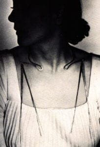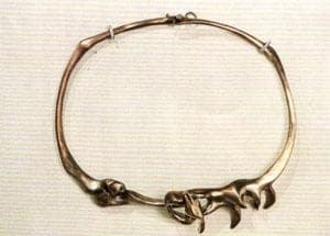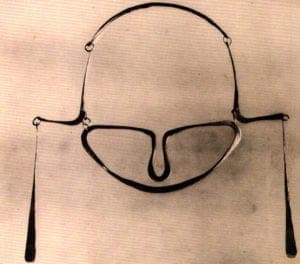 Falkenstein made "conventional" necklaces that fully encircle the neck (Figure 3), those that hand around the back of the neck and remain open in front (Figure 4) and C-shaped pieces that hang asymmetrically (Figure 5). One of her greatest contributions to midcentury jewelry design was to open the side of the necklace, which she did for the first time in 1952. The significance of this innovation lies in the effect of allowing the curve of the neck to continue in one uninterrupted sweep, rather than creating a delineation between the shoulders and face as traditional necklaces do. The design also illustrates Falkenstein's application of her principles of continuity, as the organic forms of her jewelry posit the human being as integrated with nature. Swedish jeweler, Torun Bulow-Hübe explored a similar asymmetrical concept in the early 1950s, while American, Art Smith (Metalsmith, Fall 1987) forged C-shaped necklaces, as well, 1953.