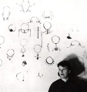 Although Falkenstein disavows any conscious connection with other contemporaneous sculptors or jewelers, she is a product of her era and shares a comparable esthetic with others artists and designers working in the 1940s and 50s. The most obvious comparison is with the jewelry of Alexander Calder. Falkenstein considers Calder's jewelry more formalized, hers freer. But the contrast doesn't end there. One of the most salient features of Calder's jewelry was his handling of the metal medium and its particular processes. His jewelry was primarily concerned with technique, while Falkenstein's aim was to depict the same signs and symbols used in her sculptures and environmental works. Her jewelry is replete with content, whereas Calder's is more naïve; that is, he was expressing the most basic, empirical approach to working metal - the result being his version of what a primitive metalsmith might produce. Whereas both Calder and Falkenstein created large-scale jewelry, the latter's was far more body-conscious and more sensitive to the effects of the wearer's movements.