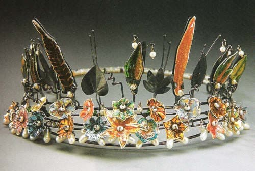 Tiaras are adornments with limited and ritualized use nowadays, but even they have not entirely disappeared. Their floral and foliate forms must surely originate with garlanded maidens welcoming in the spring season. They date at least to dynastic Egypt and enjoyed a European renaissance during the nineteenth century. Lydia Gerbig Fast recalls the floral themes and beaten gold leaves of Egyptian diadems with vitreous enamel and pearls.