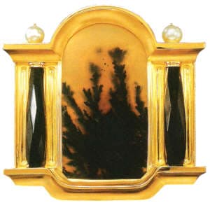 | Tom Herman, Brooch, 1999 18k gold, black dendritic agate, black onyx, pearls 2 3/4 x 2 1/2″ Photo: Ralph Gabriner |