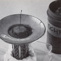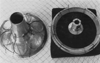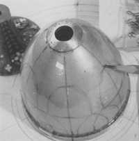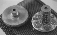 Over the same stake I raised a second domed shape - cut it out and tied it over the first with iron wires and soldered it to its base. The right of the picture shows the nut housing with the steel nut already in it; and the bottom rim on which the cup will stand. Solder is placed on the inside, where it cannot harm the enamel.