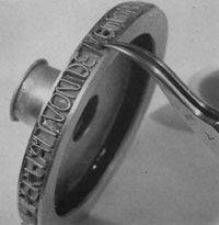 To enamel the base is about the same as the other parts. See to it that the letters touch the rims, or you might get cracks. It is most important that you apply a good layer of enamel on the inside, especially at the bottom rim!