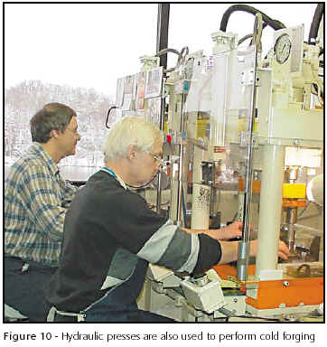 The die is bolted into a pneumatic drop hammer, Figure 9, or a hydraulic press, Figure 10. The drop hammer works on the principal of a weight being raised by air pressure in a cylinder. The air is evacuated from the cylinder and the weight falls forcing the blank into the impression. However, the force created in a hydraulic press is caused by oil being pressurized within a cylinder that slowly drives the metal into the die. The methods of generating the force are different and so are the results. The drop hammer provides a quick, sharp hit while the hydraulic system builds up pressure slowly. For the shank example, a drop hammer was used.
