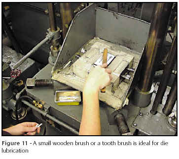 The die is lubricated with a light coat of mineral oil, Figure 11. Baby oil has been used since the early 1950's and is ideal for the job. To judge the proper amount, the brush is rubbed across the fingernail and only dry oil sheen should be left. It shouldn't be wet at all; however, there should be a light film left on the fingernail. Too much oil will settle into the cavity and clog the detail, preventing the part from fully forming. The first die used is called a start die and the draft angle is exaggerated to allow the metal to move into the cavity with less resistance. The blank is positioned over the impression and the material is then struck into the die. At this point, the finding will not be fully formed and additional steps will be needed to bring up the definition of the piece. The amount of pressure used with both systems can destroy the die, if excessive.