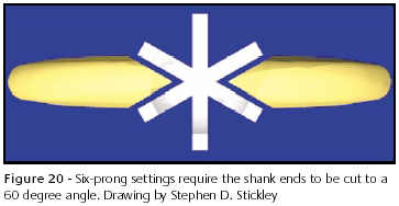 Prior to rounding the shank, the ends need to be prepared for mounting a setting. This involves shaping it for either four or six prong settings, Figures 19 and 20. There are three methods of doing this operation. Simple chopping with a punch and plate is fast, however the quality of the cut is inferior to the other two machining methods. Milling each end in a horizontal milling machine is the best method. The shank is held in a clamp and a milling cutter is run across the end making an accurate, clean cut, Figures 21 and 22.