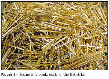 A good example of this is using a charms final trim tool as a blanker. The area where the loop for the jump ring joins the body of the charm has a corner that will be prone to cracking when it's stamped. In this case, using the trimmer for a blanker will result in the job being scrapped. Rounding out notches on the blanker will reduce this or prevent it from happening. This problem is magnified when stamping nickel white gold. For the shank used in this article, 14- karat gold square wire was used, Figure 8, because it is quick to fabricate and it has a good shape for stamping.