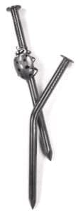 To do this, a parts list is developed that enables us to build and pre-fit subassemblies. These need to be removed for enameling and reattached for final assembly. Once we determine our parts list, Diane develops patterns representing each section as a flat drawing. At first she had to make some guesses about how to represent a three - dimensional object as a flat shape. Also, some allowance had to be made for the stretching and distortion of the metal during raising. She chose to work with two different gauges of flat copper sheet as it was immediately evident that the legs would need to be made from heavier stock than the upper body parts. After a number of experiments (and a scrap pile of failed thoraxes, mandibles and rhinoceros beetle horns), she developed a good sense for proportionally adjusting her patterns. The final pattern is transferred to a copper sheet and sawed out. The parts are textured and detailed while they are still flat using a variety of punches, grinders and chasing tools. Such texturing makes for work-hardened parts that need to be annealed with a torch prior to forming and raising. As in any raising process, it is necessary to anneal the parts a few times as they are being shaped. Diane has found Delrin™ sand-filled dead-blow hammers to be helpful in preventing arm and wrist injuries by absorbing the shock of repetitive hammering. A variety of spoon shaped stakes have been the most useful for raising the final forms. The legs are cut from the heavier sheet and ground into a more refined shape with a hand held rotary grinder and textured.