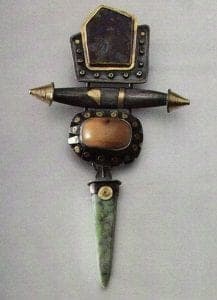 Roberta Williamson's brooch with the boat, water, and the pencil on the leaf served as a small trigger to me. It triggered all of the river scenes that I remember from my years in Ohio, where I would often go down to the Little Miami River. There was the same quality of water; there's a wonderful, gentle quality to the landscape that's so overlooked, overpowered by the majesty of the Sierras and the Rockies. In a work of jewelry she has taken a world slice, reduced it to that (the brooch), and for her and for anyone else who's experienced a river like that in the Midwest, you go from the specific - the brooch - to the general, and that general encompasses all sorts of feelings. So jewelry is like a light switch - it turns on all these emotions and remembrances - nostalgia, fear, anger, hurt, thought, puzzlement.