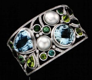 Bracelet with colored gemstones, diamonds and freshwater cultured pearls in 18 karat white gold by Ruth Grieco